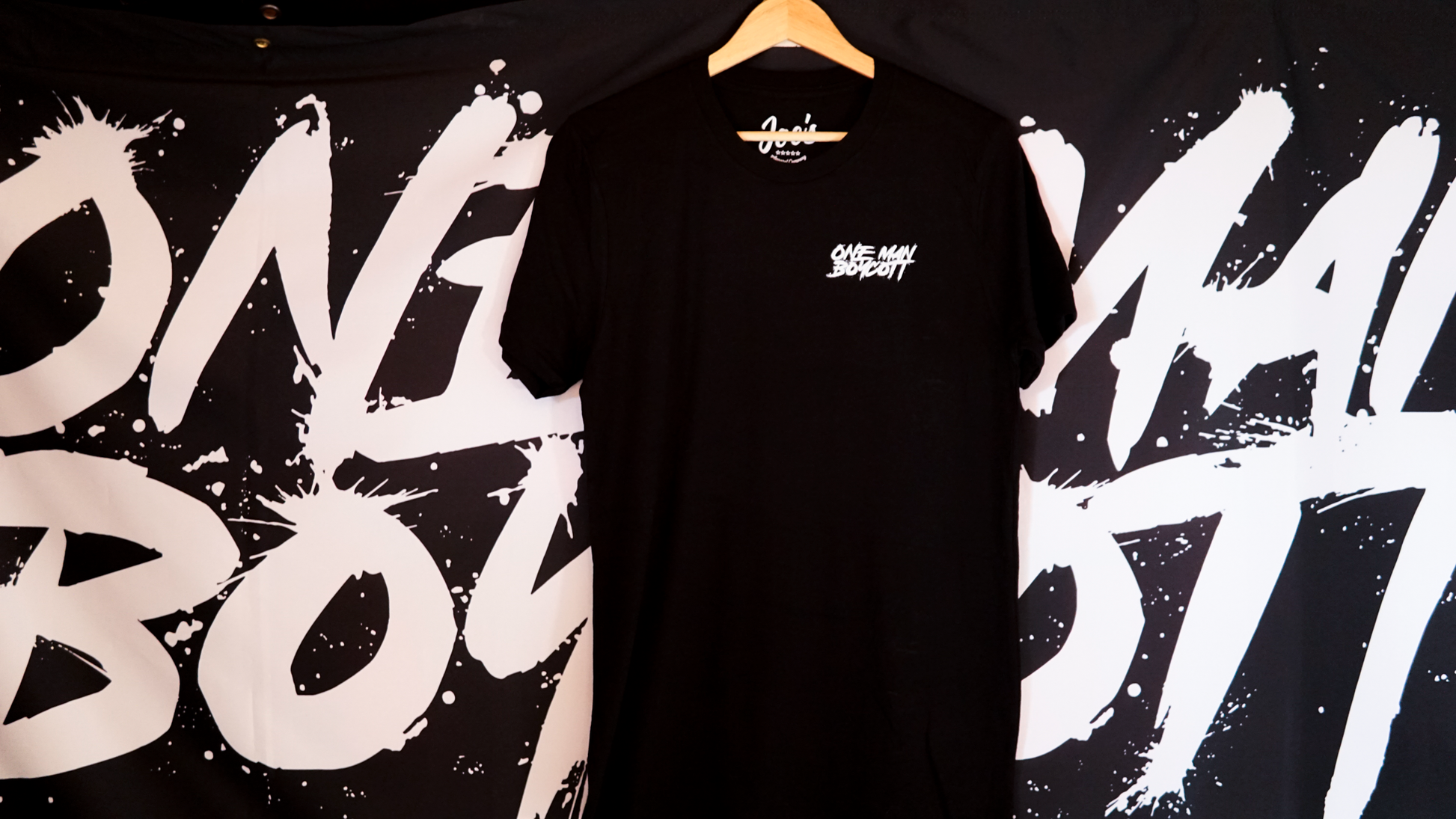 Short-sleeve One Man Boycott Face Far Radio Album art t-shirt.