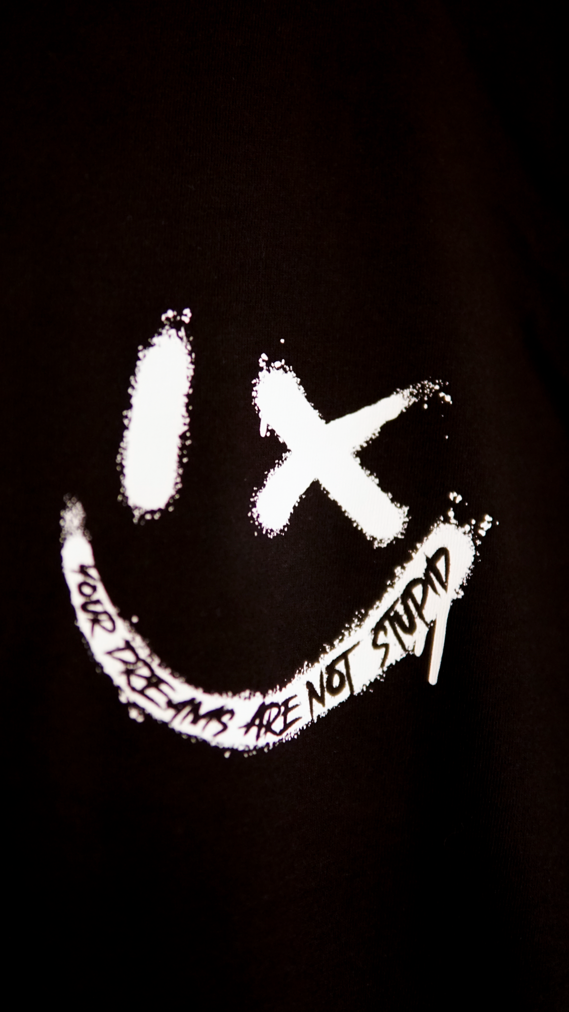 Front chest 'pocket' "Your Dreams Are Not Stupid" Smiley and full back Sick Of It All Robot printed by Joe on premium soft-fit black cotton t-shirts using eco-friendly cotton and inks.